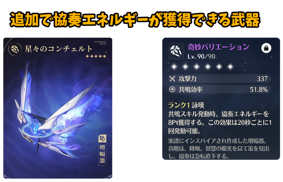モチーフ武器「星々のコンチェルト」は共鳴効率の数値がとても高く、共鳴解放発動時に協奏エネルギーが追加で獲得できるようになります。